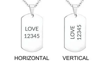 Chapas de acero inoxidable para hombre y mujer. Una cadena bola larga de 55 cm y otra corta de 10 cm están incluidas en el precio. Tienen un marco de caucho para un look fresco y auténtico. Cada chapa se puede personalizar por ambos lados con tres renglones. Las medidas de las chapas son de aproximadamente 50 cm por 30 cm. La alineación del grabado puede ser horizontal o vertical. Es el accesorio ideal para parejas o amigos inseparables. El regalo perfecto para tu media naranja en su cumpleaños, Día de San Valentín o un aniversario.